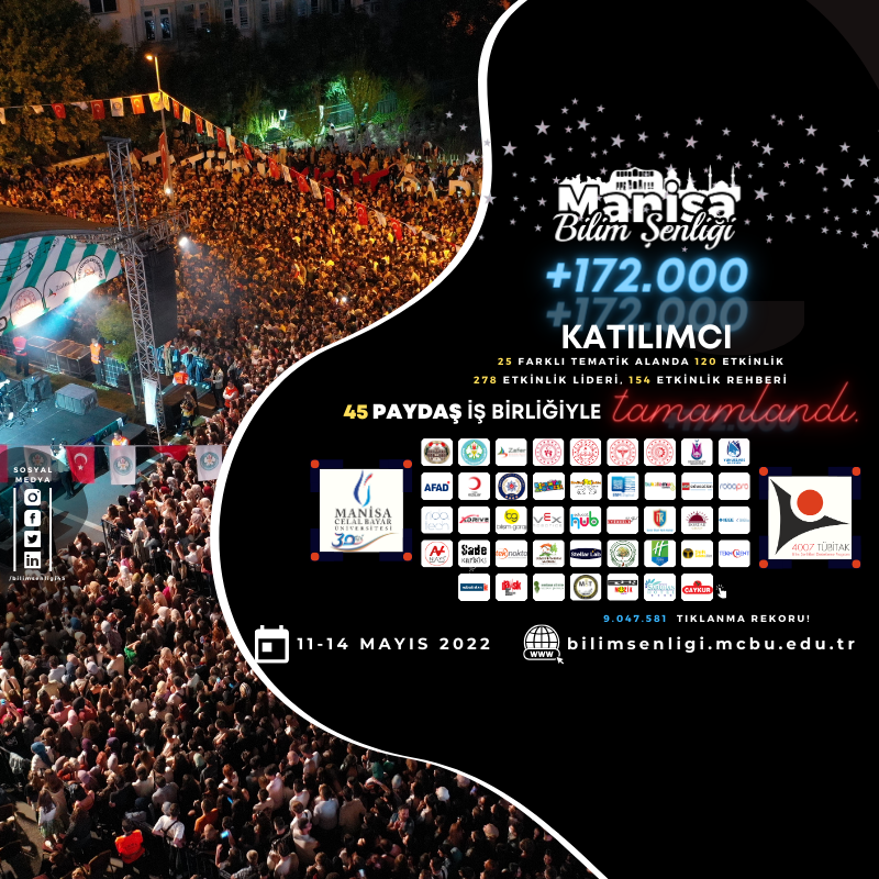 Bilimi ve teknolojiyi halkla buluşturarak bilimsel anlayışı geniş toplum kitlelerine yayabilmek, katılımcılara yaparak yaşayarak öğrenme deneyimi yaşatabilmek, bilim-teknoloji-toplum arasındaki etkileşimin etkinlikler yoluyla aktarılmasını sağlamak amacıyla TÜBİTAK desteğiyle, Manisa Celal Bayar Üniversitesi (MCBÜ) öncülüğünde paydaş kurumların iş birliği ile 11-14 Mayıs 2022 tarihleri arasında Manisa Atatürk Kent Parkı'nda bilim şenliği yapılması planlanmaktadır.