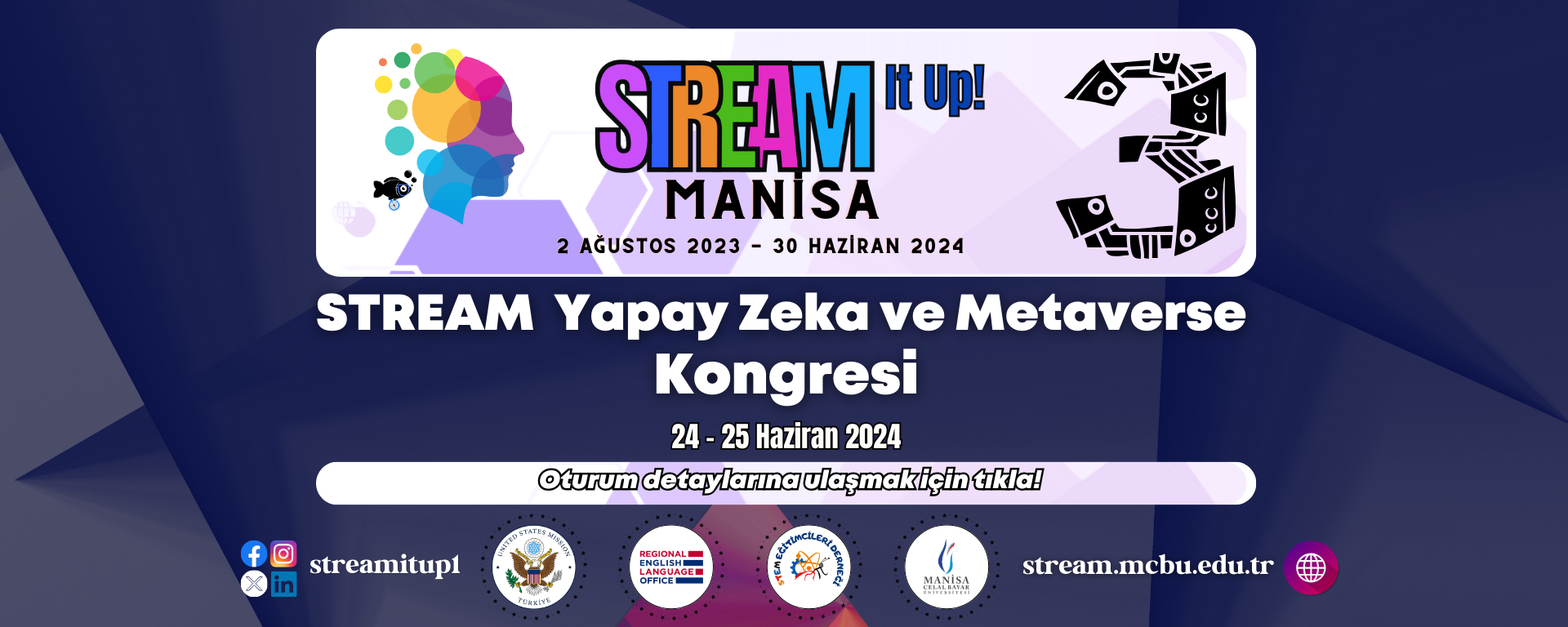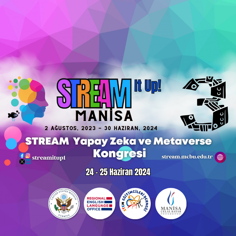 Manisa Celal Bayar Üniversitesi ve STEM Eğitimcileri Derneği tarafından düzenlenen ve ABD Büyükelçiliği tarafından desteklenen STREAM It Up!-3 projesinin 9. aşaması olan Uluslararası STREAM, Yapay Zeka ve Metaverse Kongresi, 24-25 Haziran tarihlerinde online olarak gerçekleştirilecek.